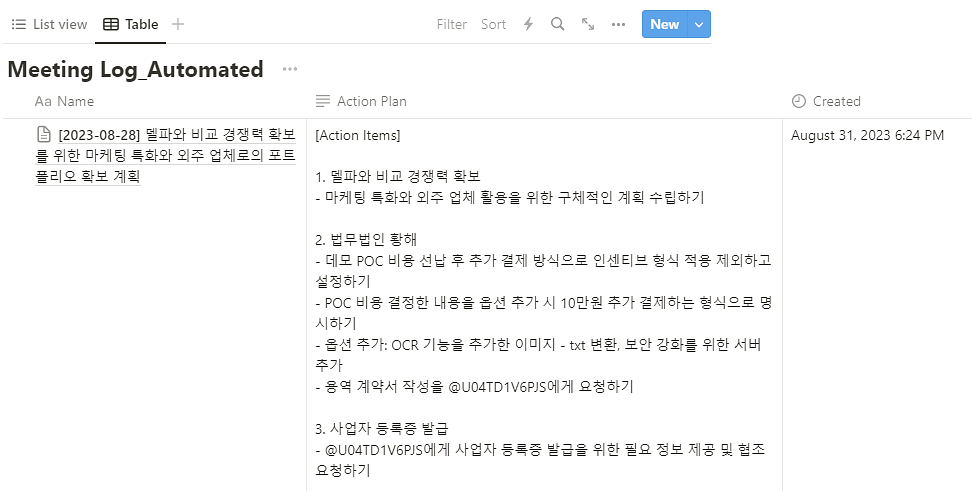 이를 토대로 완성된 예시입니다. 다음과 같이 슬랙에서 미팅록이 완성될 때마다, 해당 노션으로 자동으로 이동 및 요약, 액션플랜 정리까지 해줍니다. 너무 간편하죠! 쉽게 만드는 자동화! 이제 여러분도 해보시죠~!
