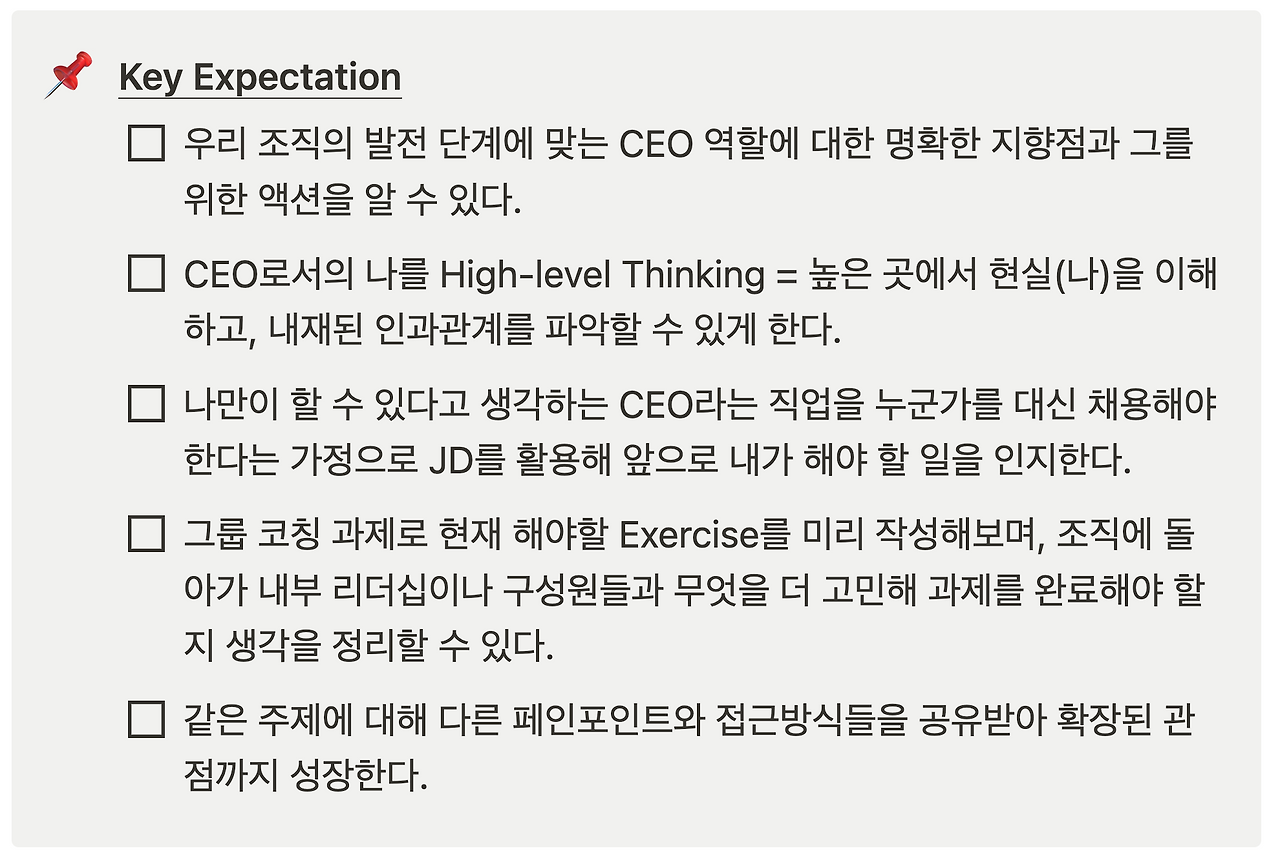 보통은 3개월 프로젝트 단위로 설정했었는데, 이번에는 매주 진행됐던 강의와 그룹 코칭마다 그 세션의 Key Expectation을 만들었다.