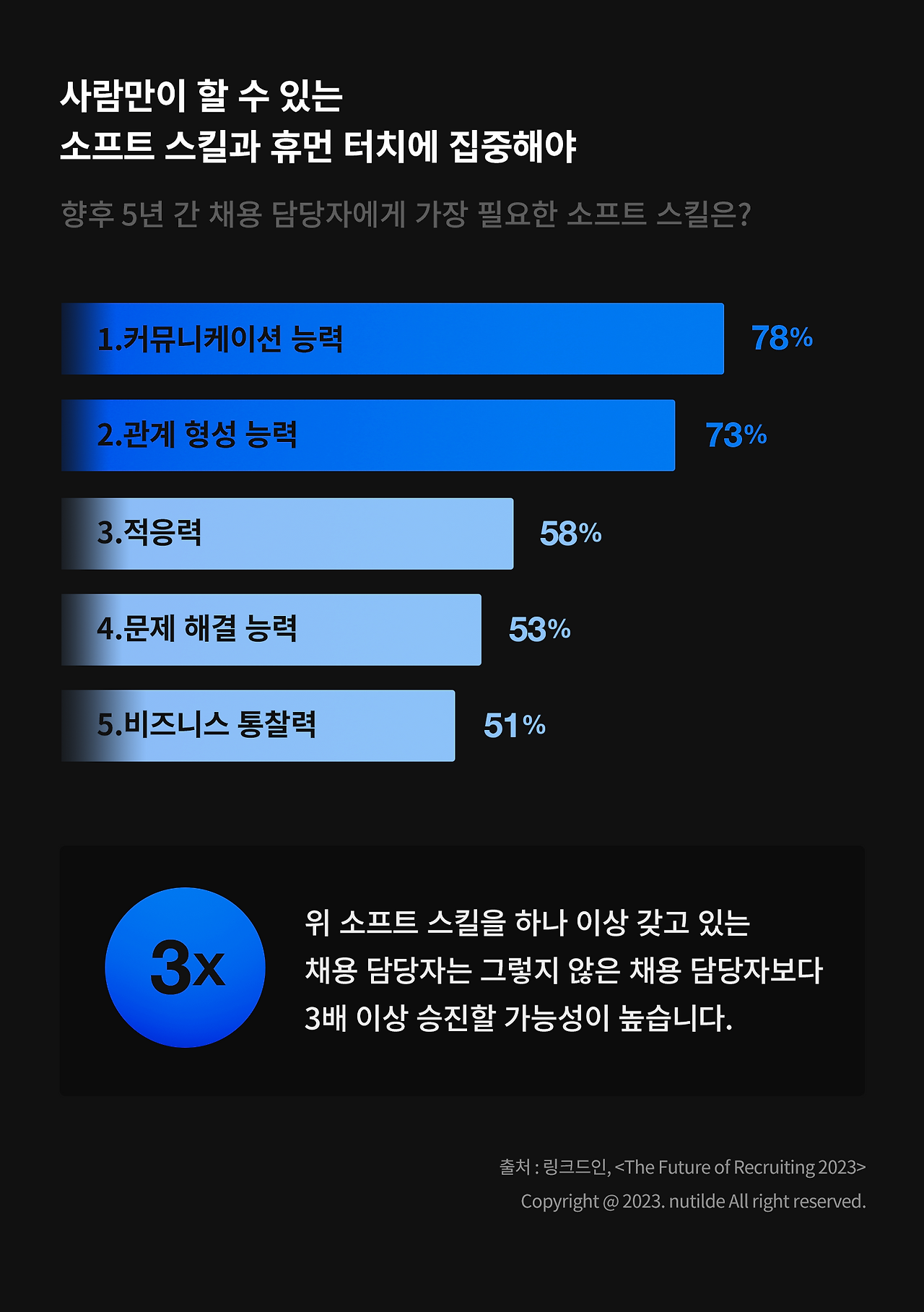 링크드인의 보고서에 따르면 채용 담당자들이 예상하는 미래도 이와 비슷합니다. AI가 잡무를 처리해주고 사람은 전략적인 업무를 우선해서 수행할 수 있으리라고 기대한 채용 담당자는 전체의 74%였습니다. 여기서 말하는 전략적인 업무는 회사의 전략에 맞는 인재풀 형성 등으로, 휴먼터치 및 소프트 스킬과 밀접하게 연관돼 있습니다. 한편 채용 담당자 73%는 향후 5년 동안 채용에서 중요한 소프트 스킬로 공감, 팀워크, 커뮤니케이션, 리더십 등을 종합적으로 발휘해야 하는 ‘관계 형성 및 유지’를 꼽았습니다.