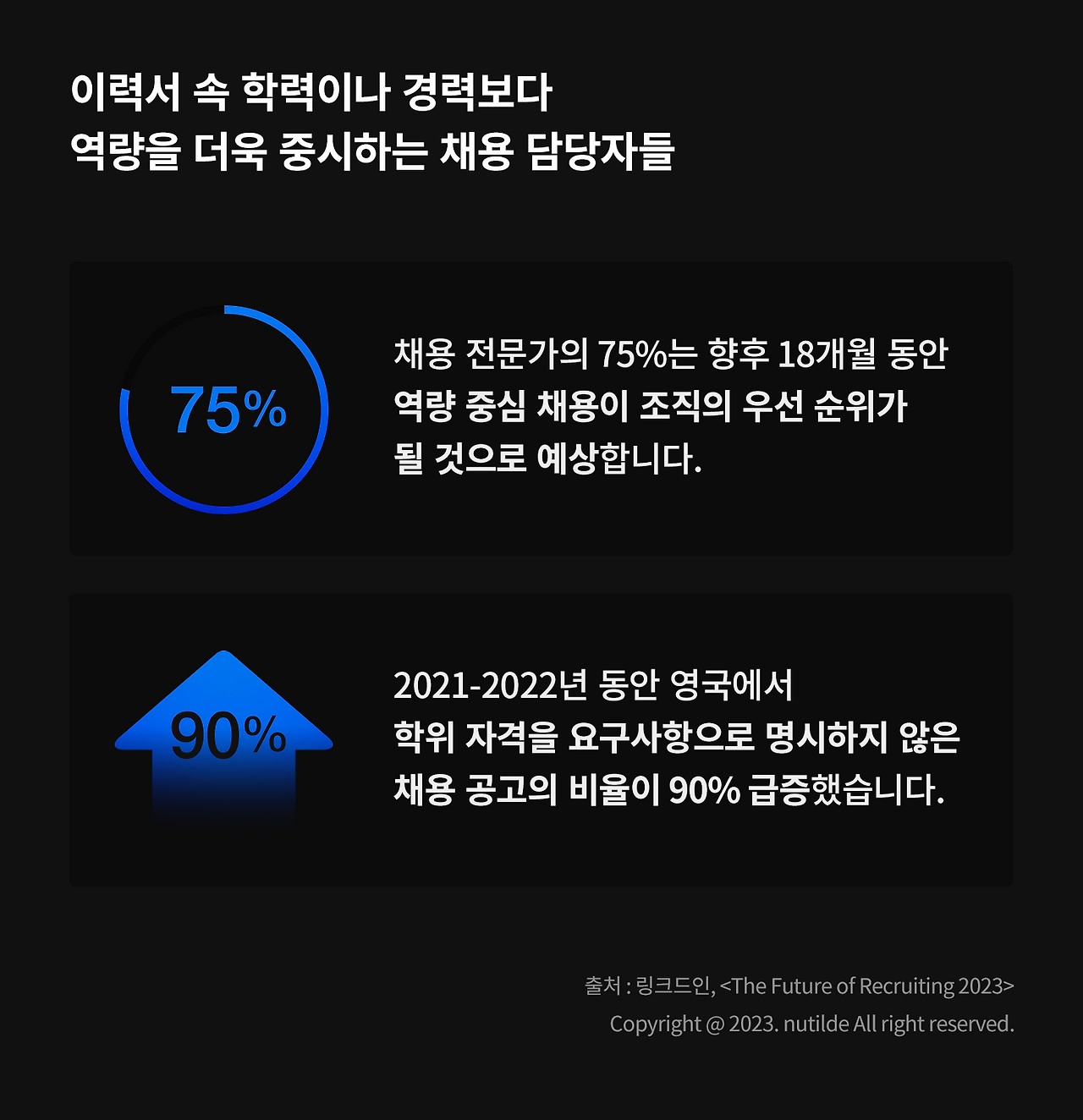 그런데 이제는 구직자들이 생성형 AI를 활용한 도구인 ChatGPT로 훌륭한 자기소개서, 경력기술서, 이력서를 쓰고 있습니다. 고용주들은 안 그래도 더 나은 후보자 평가 방식을 찾고 있던 찰나에, AI가 이력서를 만들 수 있다고 하니 전통적인 방식의 실효성에 더더욱 의문을 갖게 되었고요. 심지어 ‘이력서가 아예 쓸모 없어지고 대신 역량 중심의 채용이 대세가 된다'는 이야기도 나오고 있습니다.