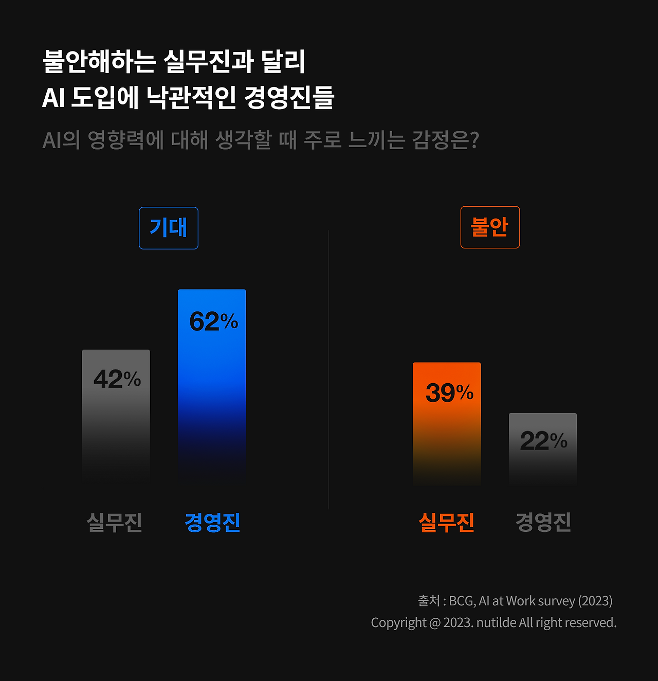 퀄트릭스와 보스턴컨설팅그룹(BCG)의 최근 설문조사에 따르면 각 기업의 60%가 넘는 경영진들이 AI의 가능성에 큰 기대를 걸고 있어요. 의사결정자들이 큰 기대감을 바탕으로 적극적으로 나서고 있기 때문에 기업들은 앞으로도 확실히 AI를 도입할 것이고, 기술은 계속 발전할 것이며, 사용 사례는 갈수록 다양해질텐데요.