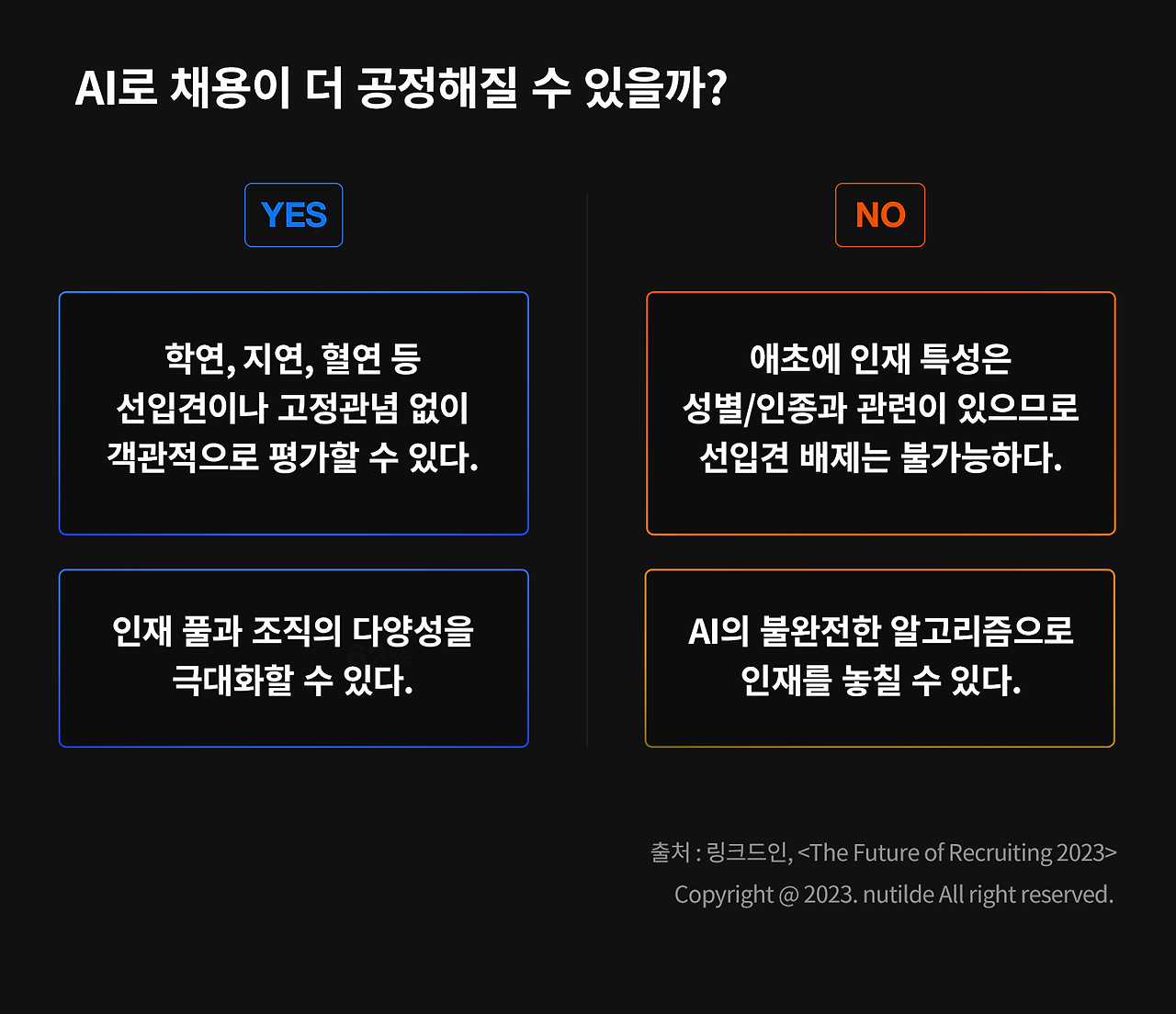 최근 한 시장조사 기관이 내놓은 AI 채용 시장 분석 보고서에 따르면 채용 프로세스에 사용되는 AI 툴 시장 규모가 2028년 12억 달러(약 1조 6천억 원)로 성장할 것이라고 합니다. SHRM(Society of Human Resources Management)의 설문조사에서는 2022년 고용주의 79%가 이미 채용 프로세스에 AI 또는 자동화 툴을 사용한다는 결과가 나왔고요. 링크드인의 설문조사에서는 미국 채용 담당자 68%가 AI 기술을 채용 프로세스에 사용했을 때 결과를 ‘아주 희망적'으로 보거나 ‘조심스럽게 낙관'한다고 답변했습니다. 그만큼 이미 기대감이 높다는 사실을 보여주죠.