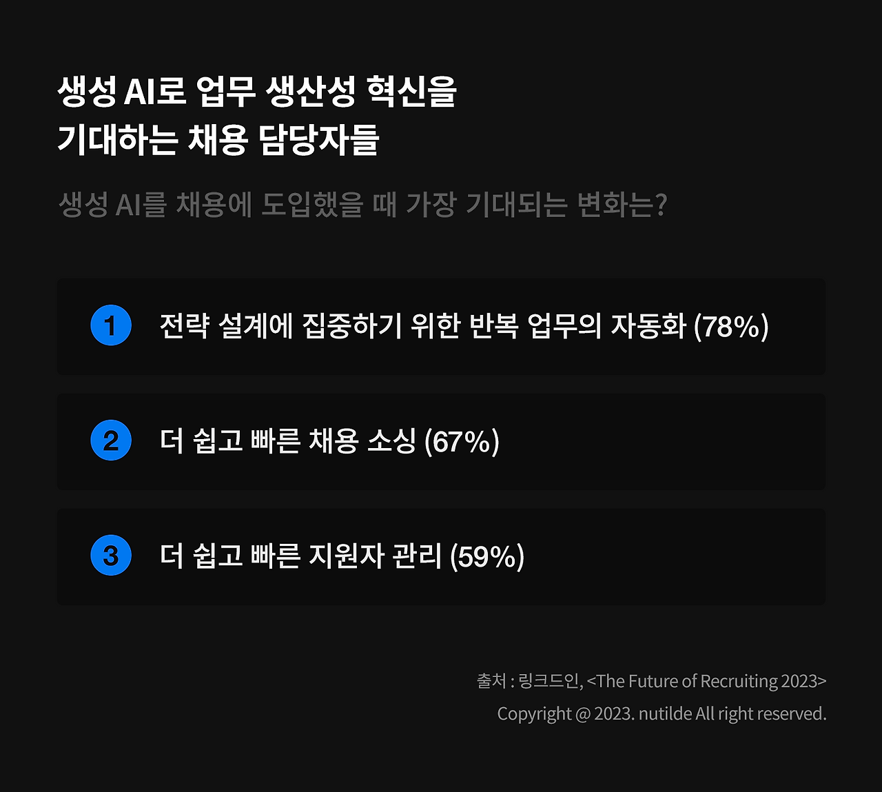 그런데 채용 분야에서는 해당 트렌드 자체보다, 이것이 기업의 시스템을 바꿀 큰 변화의 시작이라는 점에 주목하고 있습니다. 불안해하는 주니어, 인턴들과 달리 경영진은 AI가 주니어, 인턴의 업무를 수행할 수 있다는 가능성에 열광하고 어떻게든 도입하려 합니다.