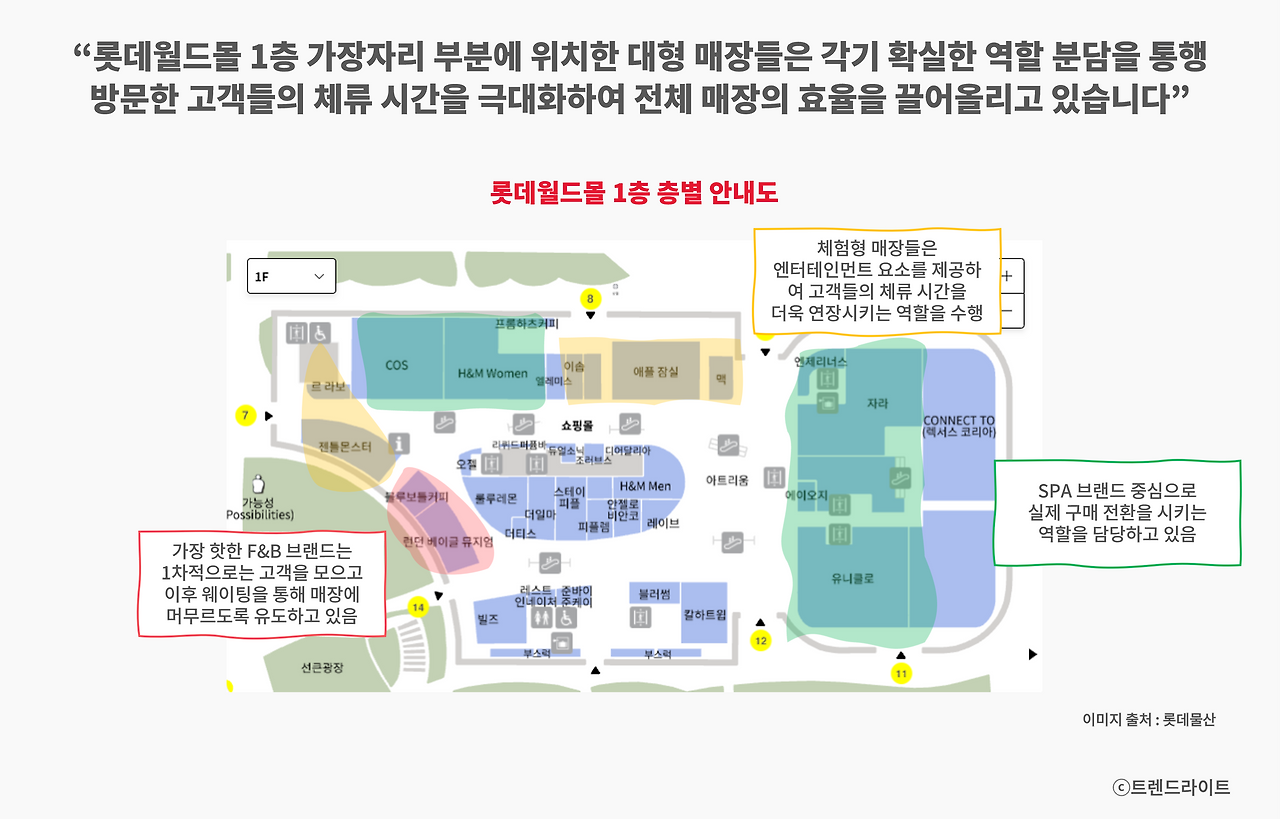 그리고 여기서 끝이 아닙니다. 당연히 최종 목표인 매출 전환까지 고객을 이끌어야 하는데요. 이때 중요한 역할을 담당하는 것이, 구매 전환 효율이 좋은 SPA 브랜드 매장들입니다. 잠실점엔 유니클로, 자라, H&M은 물론, COS, 마시모두띠 같은 프리미엄 SPA 브랜들까지 모두 입점해 있습니다. 체류시간이 길어지면서 고객들은 자연스레 부담 없는 이들 매장에서 구매를 하게 됩니다. 이렇게 되면 당장의 매출이 늘어나는 것은 물론, 이후 이들의 데이터를 활용하여 재방문과 재구매를 유도할 수 있습니다. 또한 최근에는 여기에 마르디 메크르디 같은 국내 디자이너 브랜드나, 강력한 팬덤을 지닌 아더에러, 칼하트윕 등의 매장을 입점시켜 더욱더 이러한 시너지를 강화하고 있기도 합니다. 이렇듯 철저한 공간과 고객 경험 설계가 있었기에, 롯데백화점 잠실점은 한 번 방문하면 빠져나올 수 없는 개미지옥이 되어가고 있고요.