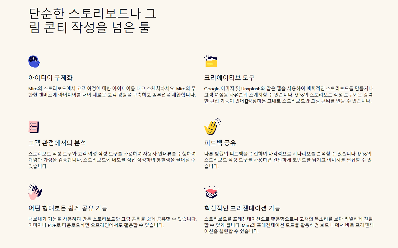 MIRO팀은 그런 발자취를 모아 스토리보드 템플릿 그 이상을 바라보고 있는 것일지도 모른다는 생각이 문득 들었다.