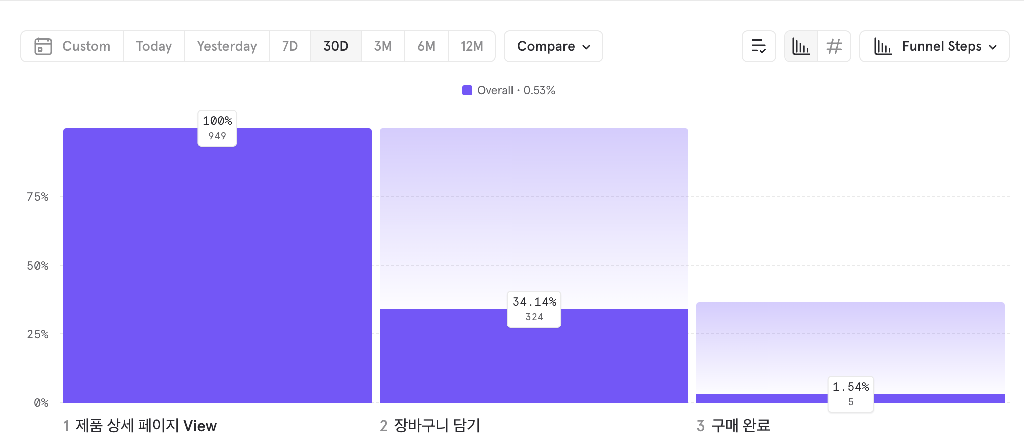아래 데이터에 따르면 최근 30일 동안 제품 상세페이지를 본 사람들 중 오직 34%만이 장바구니를 담고 구매를 완료하고 있음을 볼 수 있습니다.