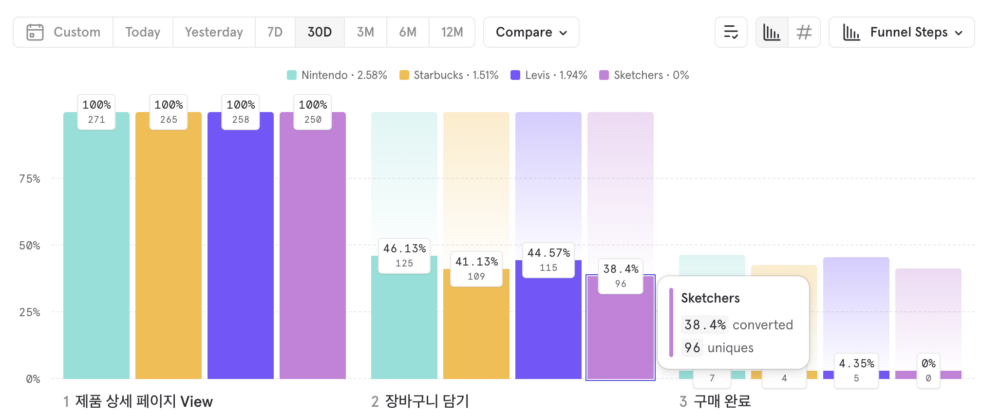 아래의 예시처럼 믹스패널의 Funnel Report를 통해 제품 상세페이지를 본 다음 장바구니를 담고, 최종적으로 구매 완료하는 사람들이 어떻게 되는지 확인해 볼 수 있습니다.