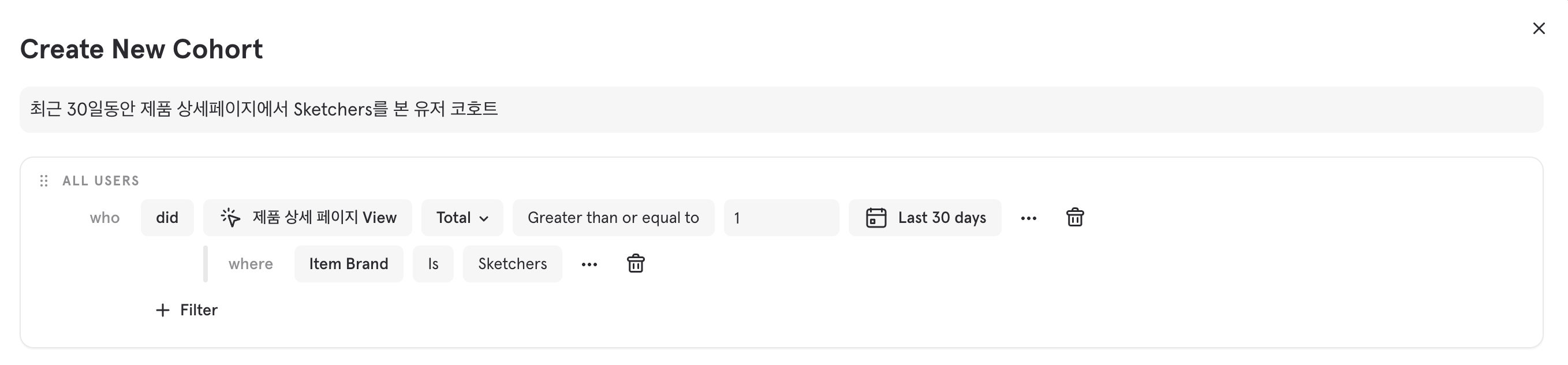 그럼, 자세한 정보를 확인해 보기 위해 스케처스 상세페이지를 본 유저들을 코호트 그룹으로 묶어보겠습니다.
