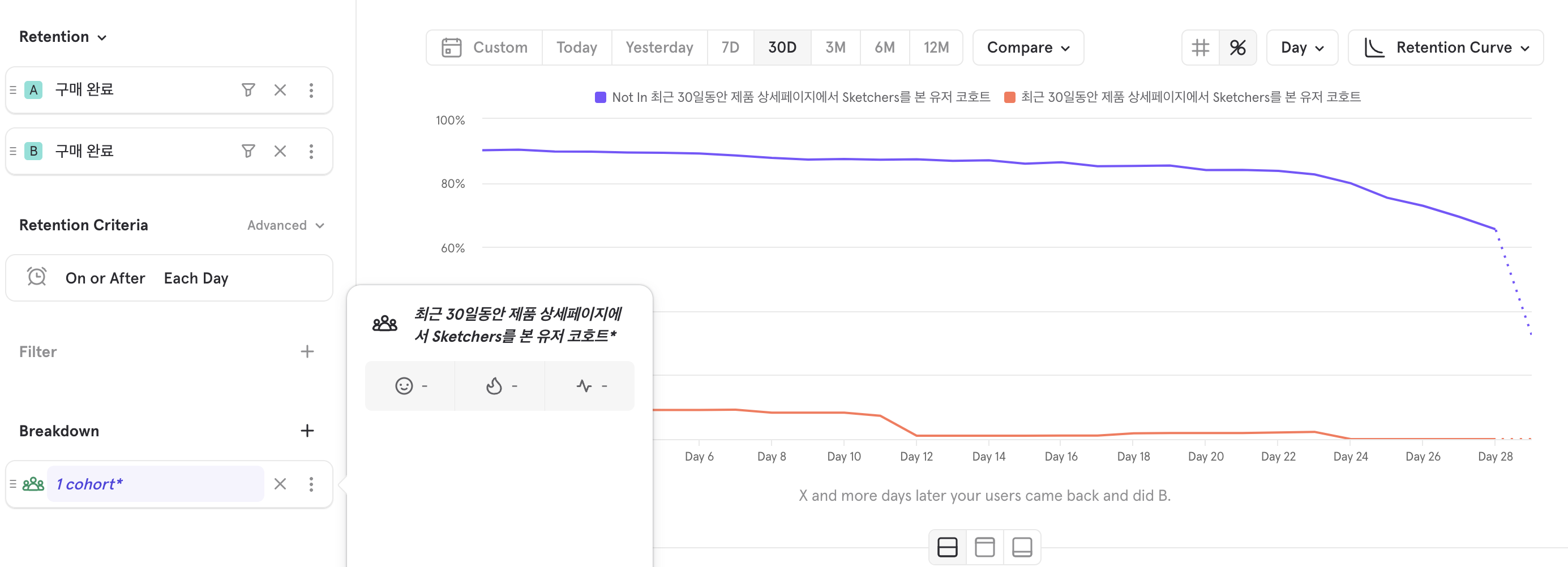 예를 들면 아래의 예시 처럼 리텐션 리포트에 해당 코호트로 Breakdown 하여 스케쳐스 상세페이지를 본 유저와 스케쳐스 상세페이지를 보지 않은 유저들 간의 재구매 리텐션율을 분석이 가능합니다.