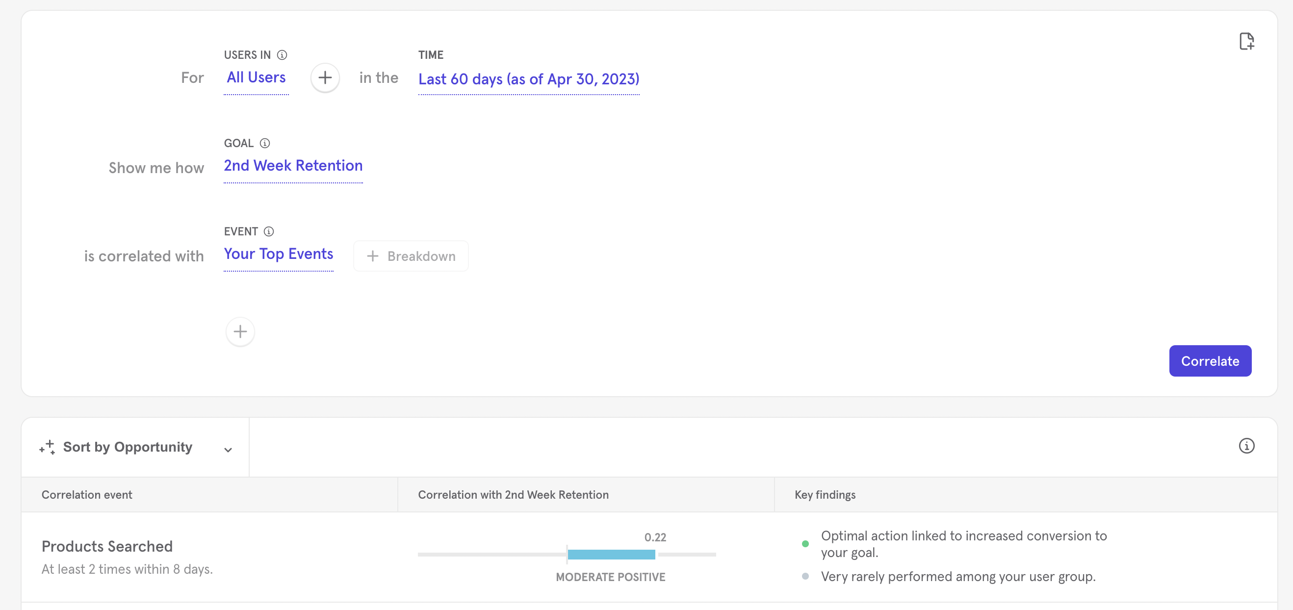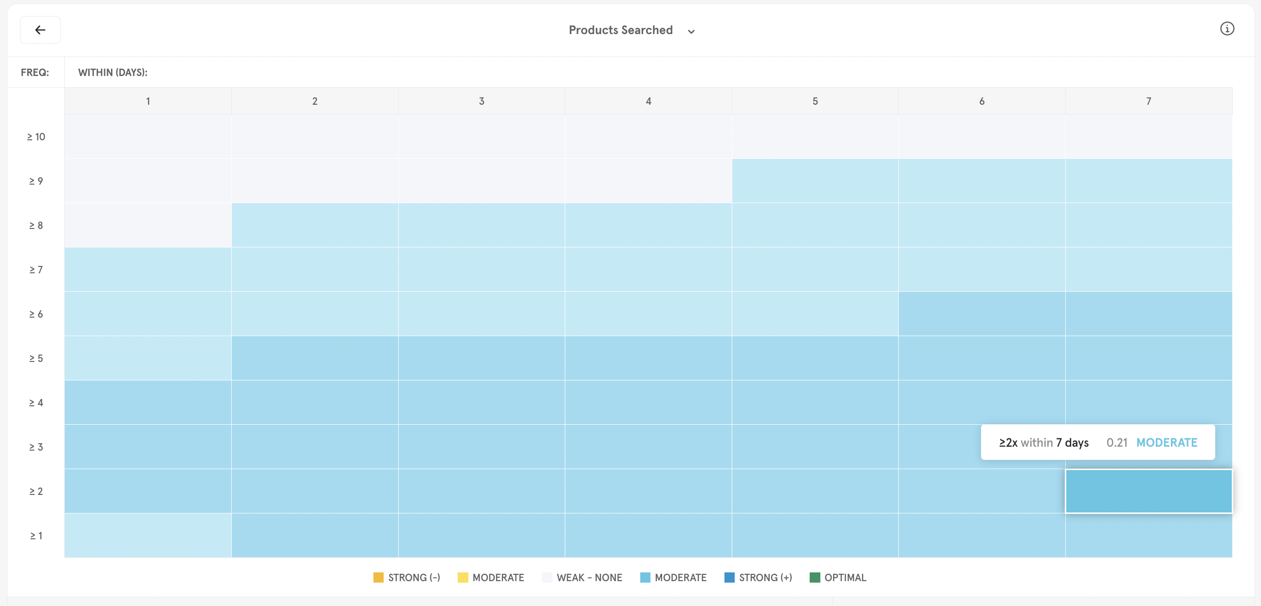 시그널 리포트를 활용해 제품을 찾는 행동 (Products Searched)을 7일 안에 최소 2번 이상하는 행동이 2주 차 리텐션율을 높이는 것과 상관관계가 강한 연관성이 있다는 것을 확인할 수 있습니다.