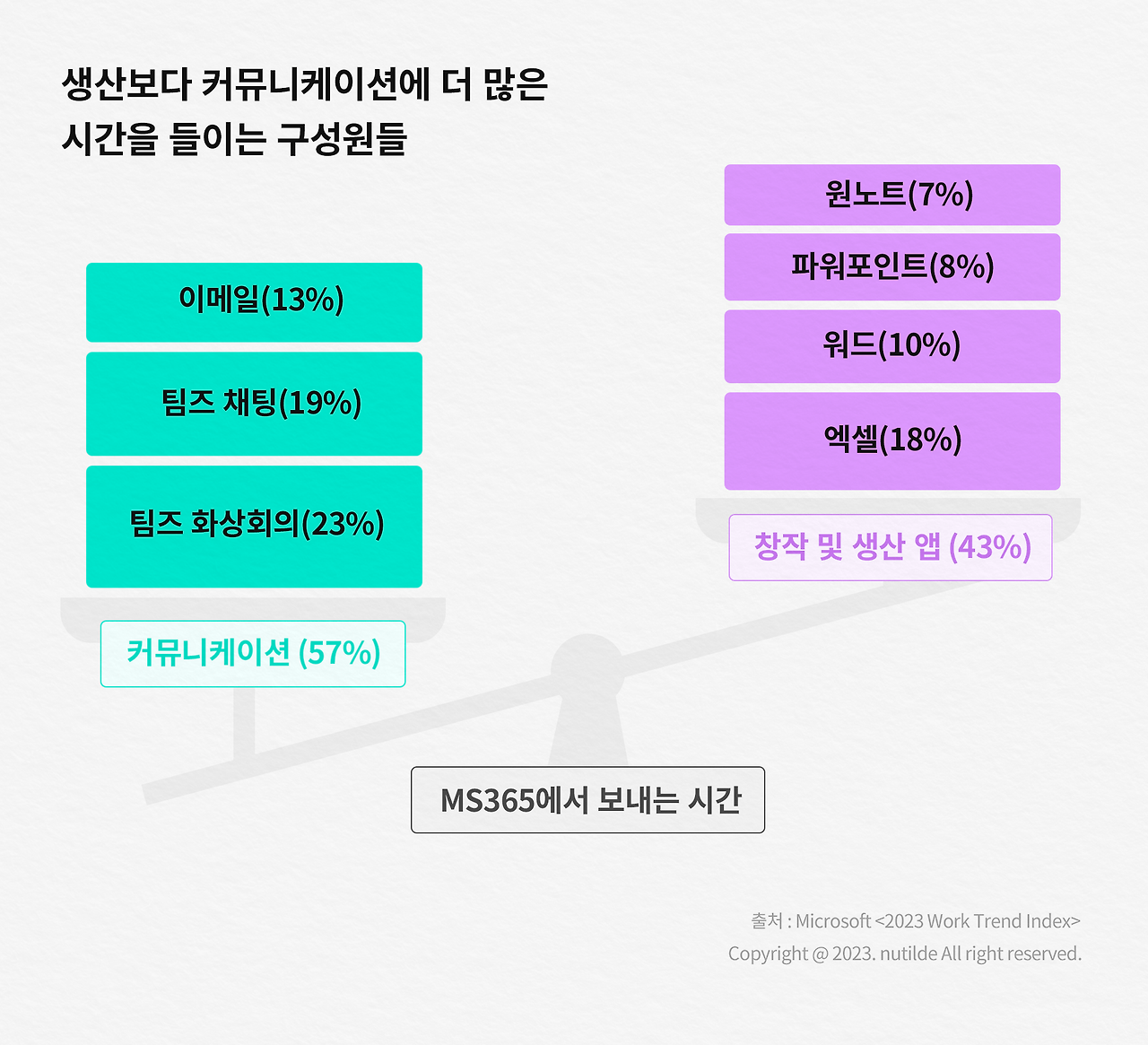 관련 내용을 조금 더 자세히 알아볼게요. 리포트에는 마이크로소프트의 대표 생산성 패키지 툴인 MS365에서 추출한 수조 건의 시그널을 분석한 결과도 실렸는데요. 이에 따르면 사용자(근로자)들은 총 근로 시간의 57%를 커뮤니케이션 앱에 할애한 반면 전체 시간 중 43%의 시간만을 창작 및 생산에 사용하는 앱에서 보냈다고 합니다. 특히 이메일을 많이 사용하는 근로자의 상위 25%는 아웃룩 앱을 일주일에 8.8시간이나 쓰고요. 회의에 지나치게 많은 시간을 쏟는 근로자 중 상위 25%는 팀즈 등 회의 어플리케이션에서 7.5시간을 보냈습니다.
