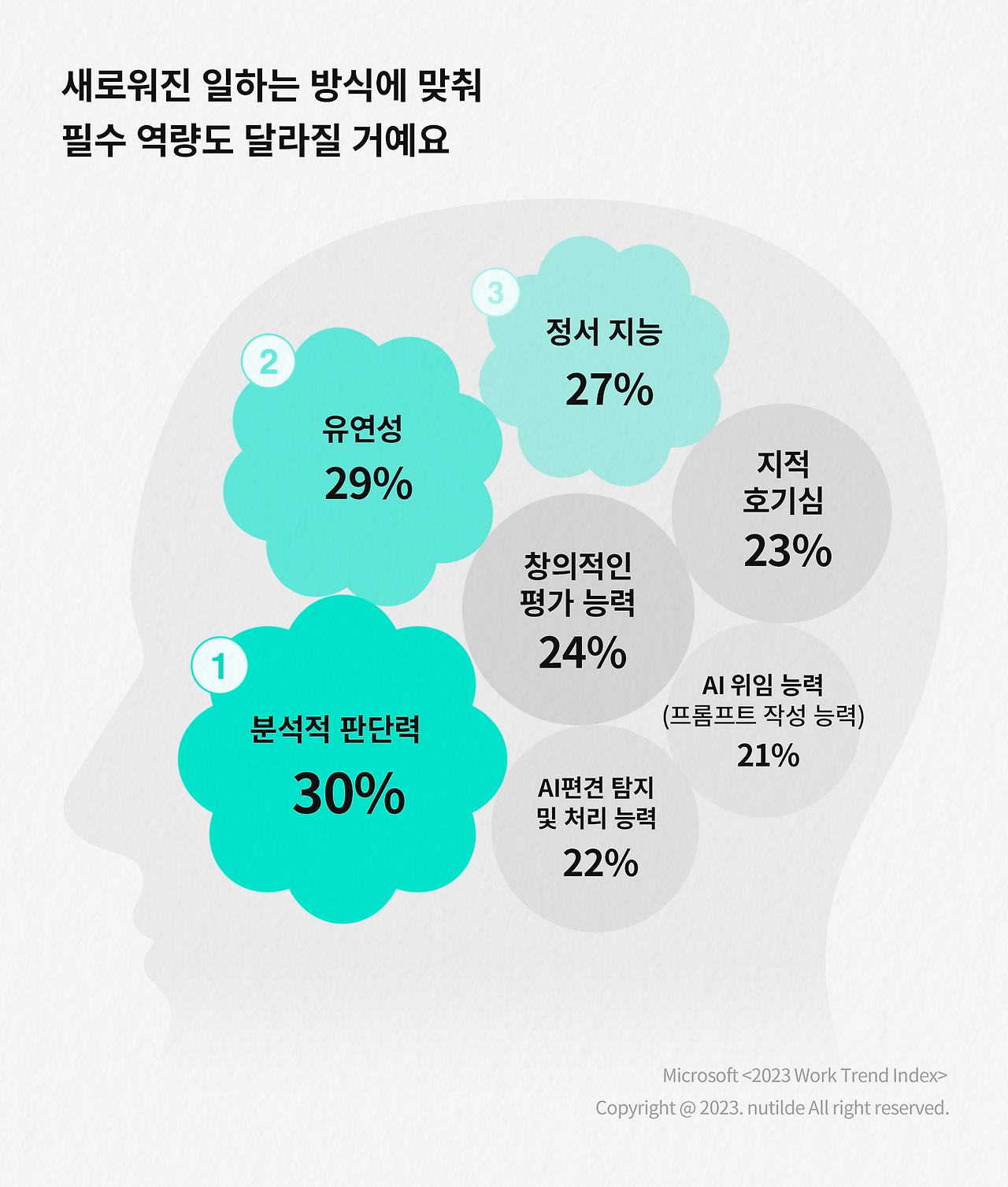 MS 리포트에 따르면 리더들은 분석적인 판단력(Analytical judgement)이 가장 필수적인 역량이라고 여기고 있습니다(30%). AI가 내놓는 대답을 그대로 받아들이는 것이 아니라 비판적으로 수용하는 역량이 필요하다는 이야기입니다.