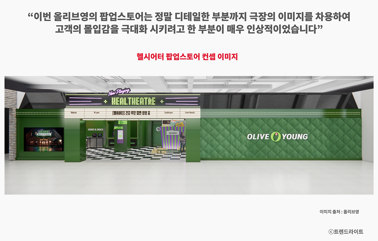 또한 가장 중요한 구매 경험도 놓치지 않고 챙겼는데, 우선 팝업 매장에서만 살 수 있는 헬시어터 루틴 기획 상품을 하루 250개 수량으로 한정 판매한다고 합니다. 현장 추가 할인 프로모션에, 상영관 관람 후 제공하는 스페셜 기프트까지 준비하였다고 하고요. 최근 팝업스토어들의 추세가 공간 자체를 인스타그래머블하게, 만들어 시선을 끌고 방문을 유도하는 경우가 많은데, 이번 올리브영 헬시어터 역시 이러한 트렌드에 걸맞게 정말 흥미로운 사례가 되지 않을까 싶습니다.