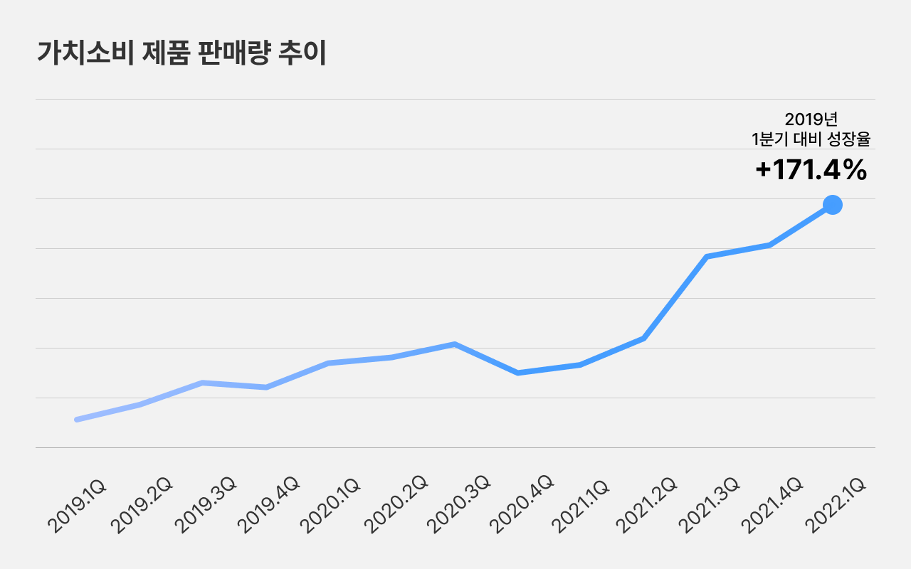과연 소비자들은 기업이 생각하는 것만큼 지속가능성에 대해 생각하고 있을까요? 롯데멤버스 리서치 플랫폼 라임에서는 최근 3년간 거래 데이터 분석을 통해 가치소비 증가추세를 확인했습니다. 그 결과 2019년 1분기 대비 2022년 1분기에 가치소비 제품의 판매량이 171.4% 증가 한걸로 나타났습니다. 분석 대상은 ‘친환경', ‘에코', ‘천연', ‘그린’, ‘비건', ‘무라벨/라벨프리' 등의 제품이였는데요. 2022년 5월 전국의 20~60대 남녀 1500명을 대상으로 가치소비 활동을 해봤냐는 설문을 진행한 결과 전체 응답자의 83.5%가 가치소비 활동을 해본적이 있다고 답했습니다.