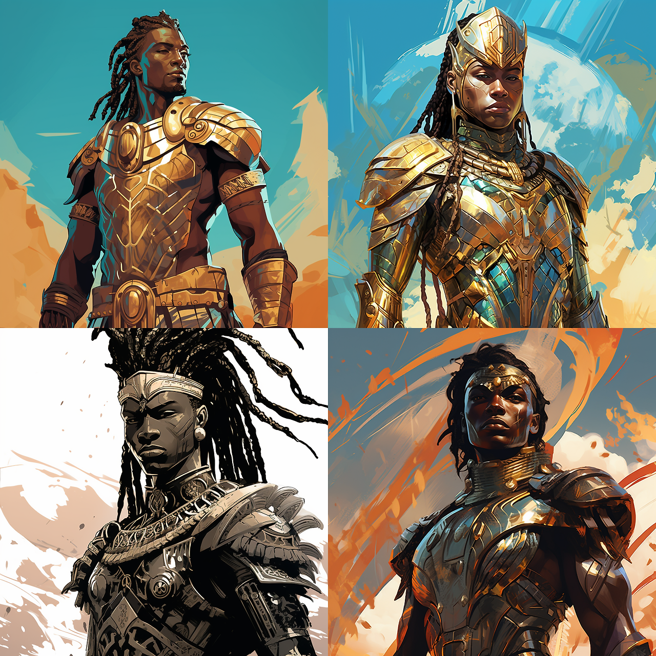 예를 들어 "미래로부터 온 전신 갑옷을 입은 아프리카 전사"라는 프롬프트를 사용해서 캐릭터를 만들 수도 있습니다. 만화 같은 외모나 초현실적인 묘사를 목표로 한다면, 미드저니는 비교할 수 없는 유연성과 정밀성을 갖춘 캐릭터 디자인을 가능케 합니다.