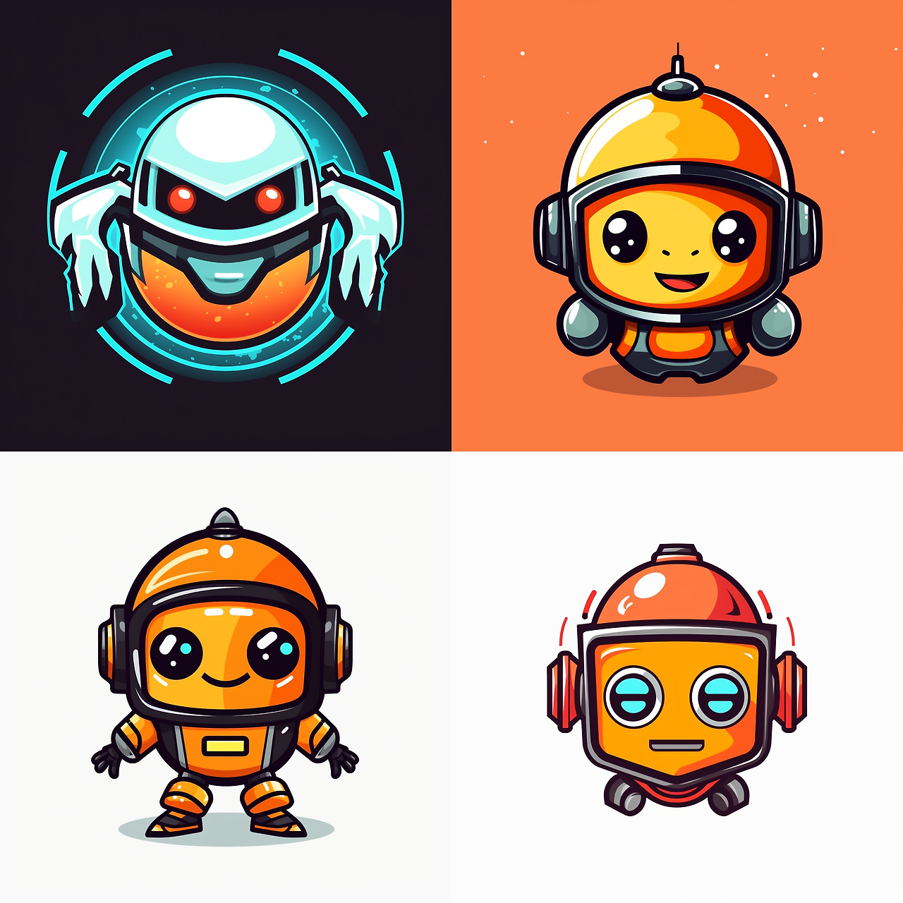 로고 디자이너는 미드저니 AI에게 특정한 프롬프트를 넣어서 브랜드 아이덴티와 일치하는 로고를 제작할 수 있습니다. 예를 들어 "로봇의 마스코트 로고, 간단하게, 벡터 - 음영 디테일 없음"과 같은 프롬프트는 흥미로운 로고 디자인을 만들어냅니다.