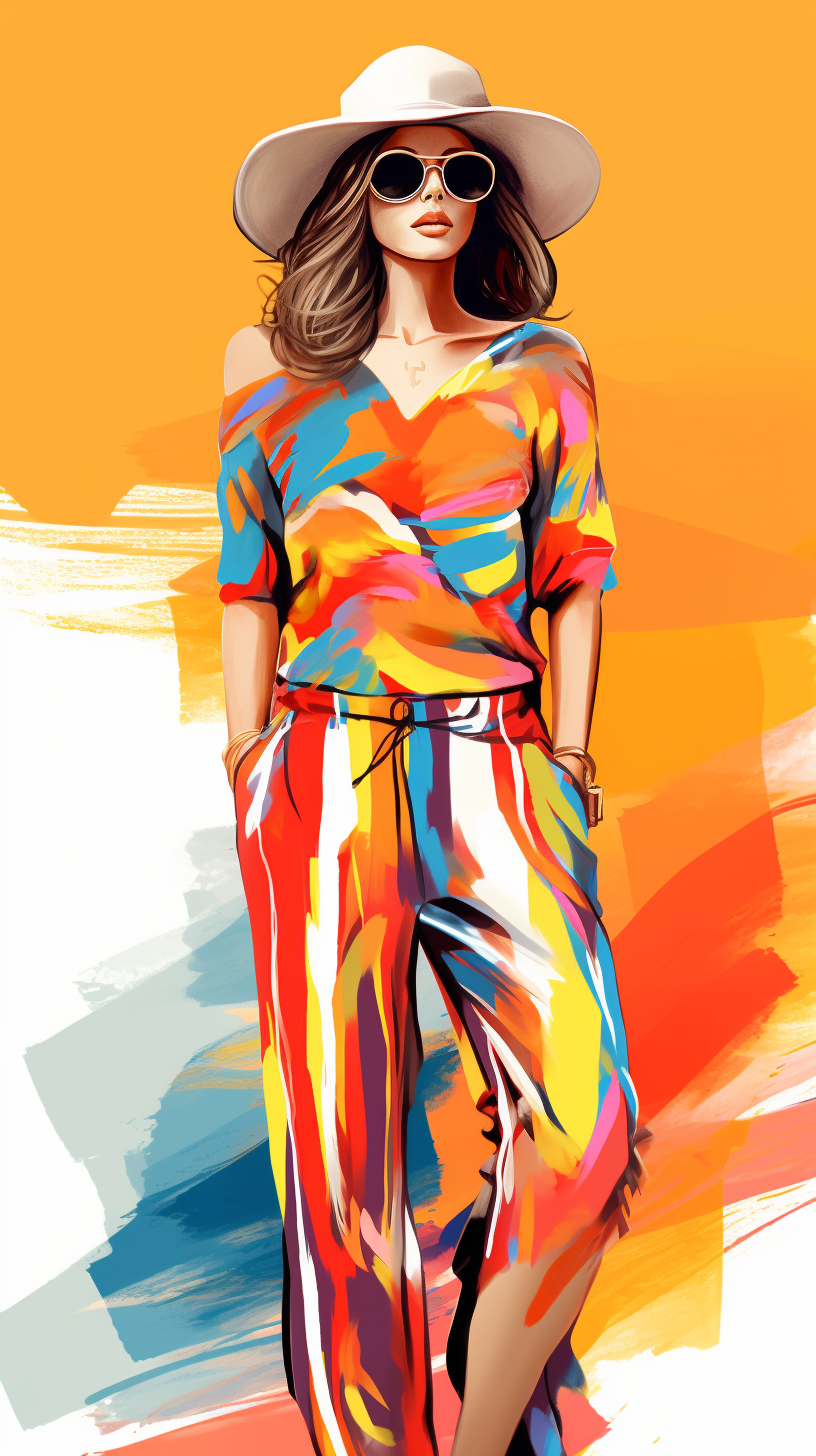 Full Body Fashion Sketch, Woman wearing Casual Wear made from Jersey, Bright colors color scheme, Bohemian style, Floral pattern, Graphic Designs, Boldness inspiration, Beach background, Summer season --q 1 --ar 9:16 --v 5.2