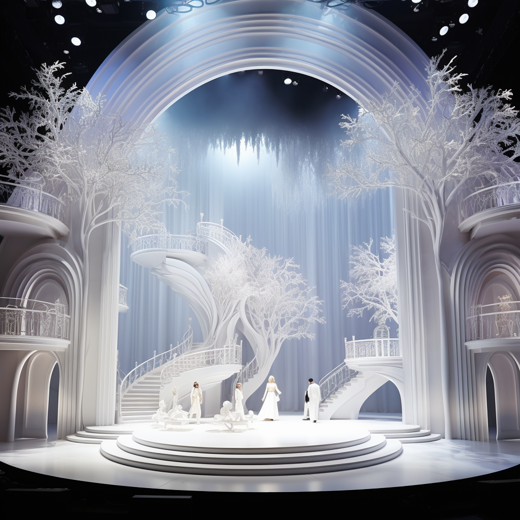spectacular stage design for a musical, with beautiful and vribrant white color scheme