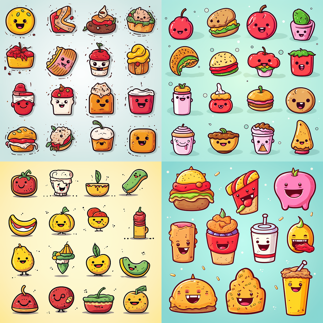 a set of emojis of food items in hand-drawn style expressing deliciousness suitable for light mode backgrounds